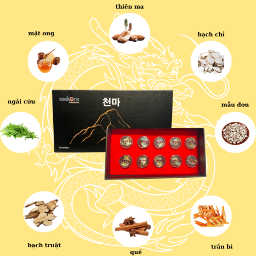 60% củ thiên ma, mật ong nội địa hàn, rễ bạch chỉ, mẫu đơn, trần bì, quế, bạch truật, ngải cứu, mật ong